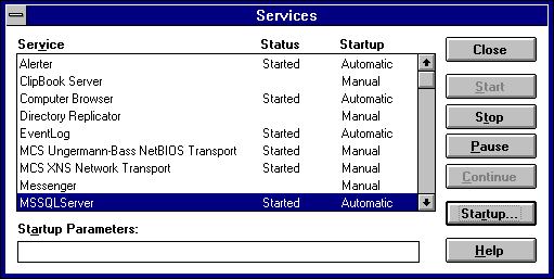 The SQL Server service is named MSSQLServer. The SQL Executive service is named SQLExecutive.
