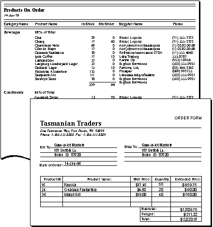 Next, gather all the forms and reports that contain information the database should be able to produce. The company currently uses a printed report to keep track of products being ordered and an order form to take new orders. The following illustration shows these two documents.