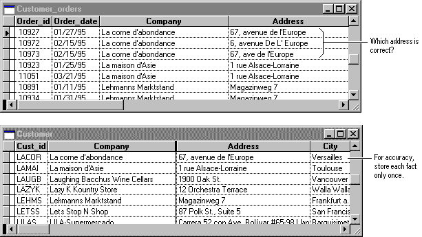 Also, if the customer moves, you’d have to either accept contradictory information or find and change each of that customer’s sales records in the table. It’s much better to create a Customer table that stores the customer’s address in your database once. Then, if you need to change the data, you change it only once.