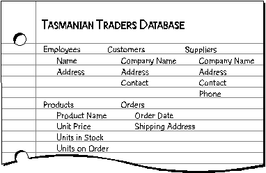 Although the finished Tasmanian Traders database contains other tables, this list is a good start. Later in this chapter, you’ll see how to add other tables to refine your design.
