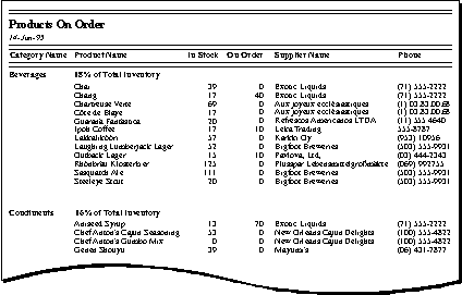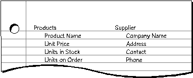 The report indicates that the Products table, which contains facts about products sold, needs to include fields for the product name, units in stock, and units on order, among others. But what about fields for the supplier name and phone number? To produce the report, Visual FoxPro needs to know which supplier goes with each product.