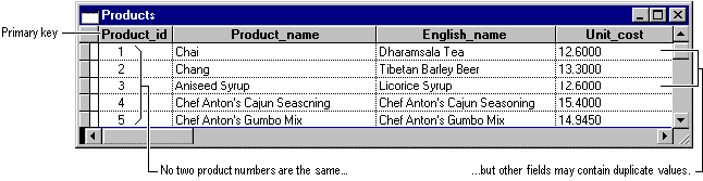The primary key of the Tasmanian Traders Products table contains product ID numbers. Because each product number identifies a different product, you don’t want two products with the same number.