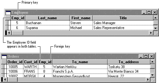 For example, suppose that you want to phone an employee with questions about a sale the employee made. Employee phone numbers are recorded in the Employee table; sales are recorded in the Orders table. When you tell Visual FoxPro which sale you’re interested in, Visual FoxPro can look up the phone number based on the relationship between the two tables. It works because Employee_id, the primary key for the Employee table, is also a field in the Orders table. In database terminology, the Employee_id field in the Orders table is called a foreign key, because it refers to a primary key from a different, or foreign, table.