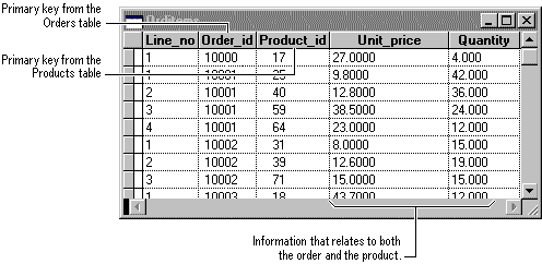 Each record in the Order_Line_Items table represents one line item on an order. The Order_Line_Items table’s primary key consists of two fields — the foreign keys from the Orders and Products tables. The Order_id field alone doesn’t work as the primary key for this table, because one order can have many line items. The order ID is repeated for each line item on an order, so the field doesn’t contain unique values. The Product_id field alone doesn’t work either, because one product can appear on many different orders. But together the two fields in the junction table always produce a unique value for each record. The junction table does not require its own primary key.