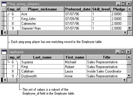 One-to-one relationships between tables are unusual because in many cases, the information in the two tables can simply be combined into one table. For example, suppose you created a table, called Ping-Pong Players, to track information about a Tasmanian Traders Ping-Pong fundraising event. Because the ping-pong players are all employees of Tasmanian Traders, this table has a one-to-one relationship with the Employee table in the Tasmanian Traders database.
