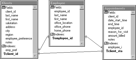 This database structure stores appointments for a professional office, and could easily be modified for use in an office of doctors, dentists, lawyers, or accountants. The Appointments table has a multiple-field primary key to uniquely identify each appointment. This primary key, the “client_sta” index, is created by indexing on an expression that combines the client_id and date_start time fields.