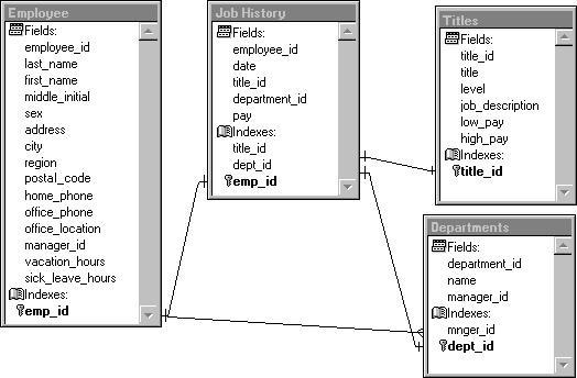 This database structure stores human resources information. The Job History table stores information on each hire or promotion, so it can contain many records for each employee.
