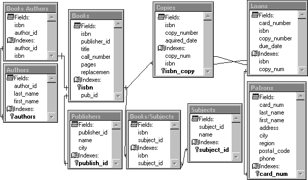 This database stores information about library books and loans to patrons. Notice the many-to-many relationships between the Books and Authors tables and between the Books and Subjects tables.