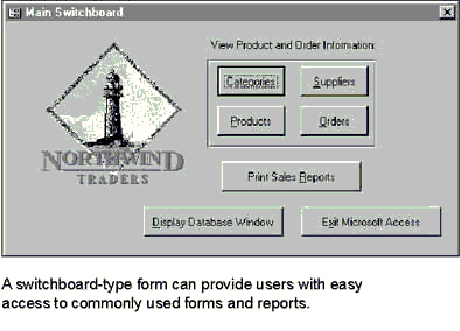 If, in contrast, your application contains numerous forms and reports and you can’t predict which one a user would want to use first, you can start the application by displaying a form that acts more like a switchboard. This type of form often uses command buttons to group related objects and tasks.