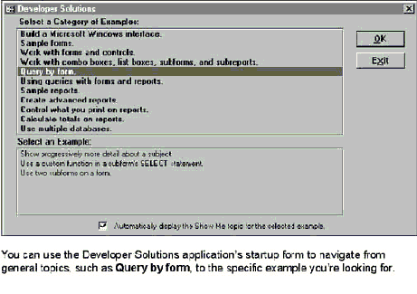The Developer Solutions sample application, which shows different ways to address common application design issues, has another type of startup form. Its startup form is a navigation tool you use to find the solution you want.