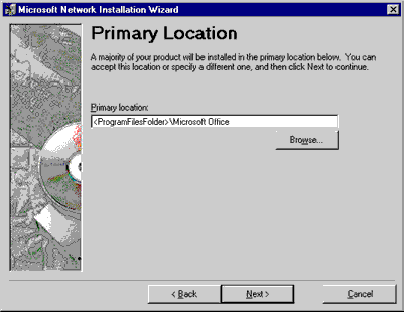 The Network Installation Wizard then displays the name of the folder where the main Office application files are installed during client Setup. You can change the default folder by entering a new name, or by clicking Browse and selecting a new folder.