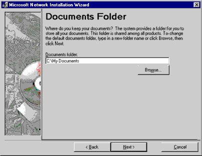 Both Windows 95 and Windows NT Workstation version 4.0 provide a default folder to store all user documents, including Office documents. By default, this folder is named My Documents and is located at the root directory of the C drive. If the default folder has not yet been defined on the user's hard disk, the Network Installation Wizard allows you to specify a name and path for this folder, which is created during client Setup. If the folder has already been defined in the user's hard disk, then setting this option has no effect.