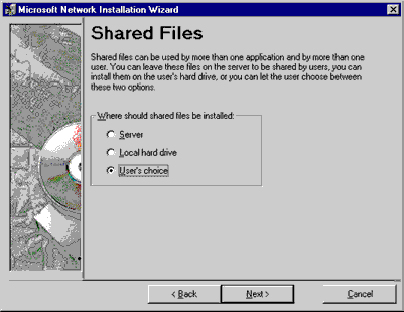 Next, the Network Installation Wizard displays a panel similar to the dialog box that was displayed when you created the administrative installation point. The options in this panel determine whether users choose where to install shared applications, or whether you make that choice for them. The panel contains these options: