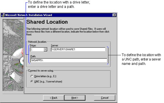 Under Connect to server using, you can specify whether you want the location of the shared applications to be defined with a drive letter or with a UNC path. If you select the Drive letters option here, you must enter a drive letter and a path under Network location. You do not need to have a valid connection to the drive while running the Network Installation Wizard. However, users must have a valid connection to the drive during client Setup. If you select the UNC option, you must enter a server name and path under Network location.