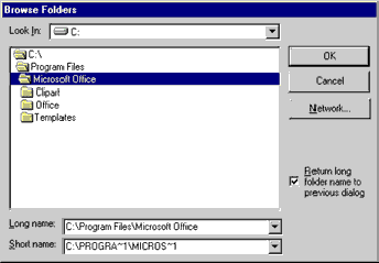 With the Browse button you can modify the default folder for a selected option. Both the long and short names of the folder you select are kept in the STF file. However, the Return long folder name to previous dialog check box in the Browse Folders dialog box determines which form of the name is displayed in the Components panel. This option does not affect the STF file, but only the way you view the folder name in the Network Installation Wizard. (The default is to use long folder names.)