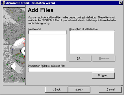 The Network Installation Wizard allows you to add files to the Office installation process. These are additional files, provided by you, that Setup installs along with the Office files. For example, you could add a Word template file you have created for your workgroup to use.