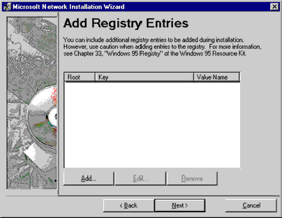 The Network Installation Wizard allows you to add registry entries to the user's Windows registry during the installation process. This can be useful if, for example, you have written an application that relies on the contents of a particular registry entry. You can add the entry to Office Setup so that your application is ready after the user installs Office.