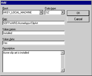 For example, you can enter the new registry key HKEY_LOCAL_MACHINE\SOFTWARE\AcmeApps\ClipArt\Installed with a value of Yes using the following entries in the Add dialog box.