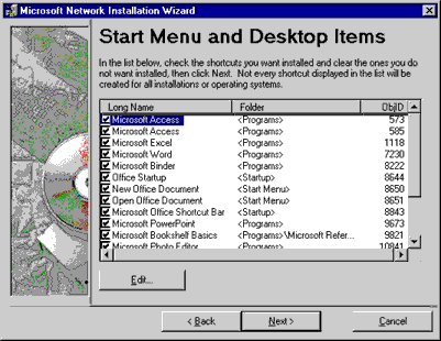 Why Are There Duplicate Items in the List? In some of the lists displayed in the Network Installation Wizard, you may see what appear to be duplicate entries. This occurs because there are several execution paths that Setup can take through the STF file, depending on the configuration of the user's computer and whether Setup finds a previous version of Office installed. The same question may appear in more than one path; however, Setup asks each question only once during installation. Because the Network Installation Wizard does not know what path Setup will take, it displays every instance of a question. If you want to specify a default answer, you must do so for all the duplicate questions in the list, so that Setup uses the same answer in every context. In these lists, the Network Installation Wizard displays an Object ID column with the heading ObjID. The Object ID is a number in the STF file that uniquely identifies each item in the list. This number helps the Network Installation Wizard distinguish between duplicate items in the STF. You do not need to use this number when running the Network Installation Wizard.
