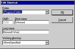 To change the properties of a shortcut, select it in the list and then click Edit. In the Edit Shortcut dialog box, you can change the folder in which the shortcut is installed, as well as the name and working folder of the shortcut.