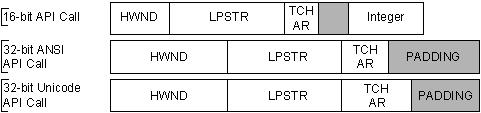 To illustrate how this change in size can affect a call, recall the fictional MyAPICall API used earlier. The MyAPICall call needs the handle to the application's window (HWND), a string, a character, and an integer to be placed on the stack. In C, the function would be: