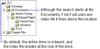 Find Fast looks for an index file in the My Documents folder. If it does not find one there, it looks up the folder tree, all the way to the root of the drive. Find Fast uses any index file it finds in or above the default start location in the search.