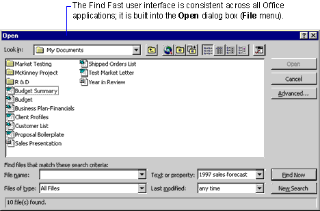 Document searching functionality is built into the Open dialog box (File menu) of Access, Excel, PowerPoint, Word, Office Binder, and Microsoft Project. The Text or property box and all controls in the Advanced Find dialog box (viewable by clicking the Advanced button in the Open dialog box) rely on indexes created by Find Fast.