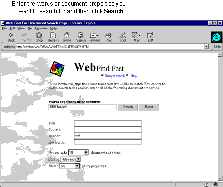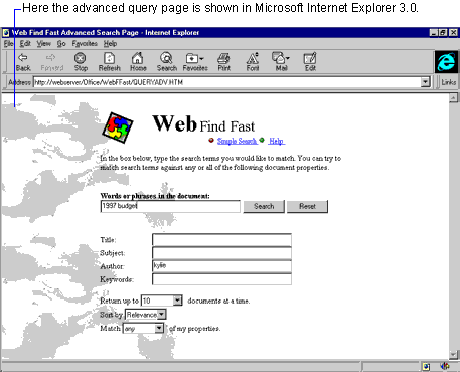 The user interface for searching with Web Find Fast is an HTML query page viewable in a Web browser. Web Find Fast includes two query pages, Query.htm and Queryadv.htm: