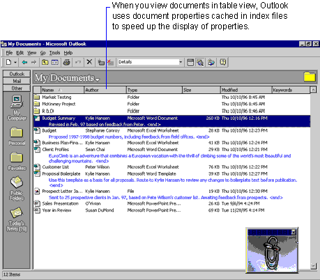 Outlook uses the document properties cached in a Find Fast index, if available, when displaying Office documents in table views.