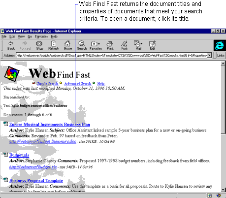 Web Find Fast returns not only the names of the found documents but also other document properties if they are available from the index. Selecting a found document opens it in the appropriate Office application.