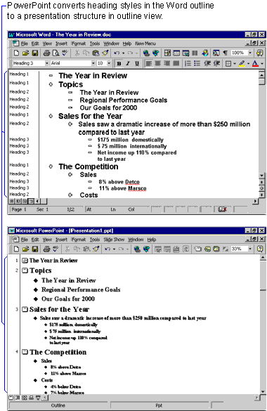 Word exports the headinglevel paragraphs to PowerPoint. The Word document opens in PowerPoint as a new presentation in outline view.