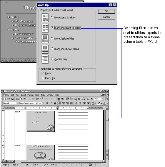 You can export the outline of a Word document to PowerPoint. If the paragraphs are formatted as heading styles in Word, PowerPoint structures the presentation outline according to the heading styles. Every Heading 1 paragraph becomes the title for a new slide, a Heading 2 paragraph becomes the first level of text, and so forth. Text formatted as anything other than a heading style is not imported to the presentation.
