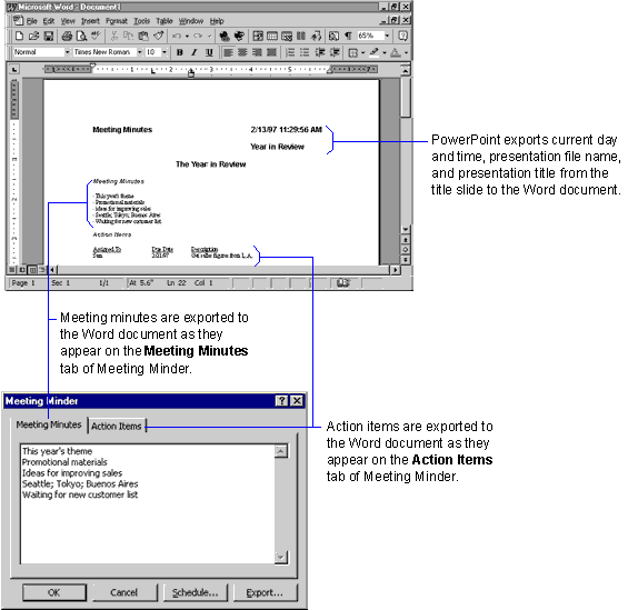 PowerPoint starts Word, opens a new document based on the Normal template, and exports the meeting minutes and action items to Word, as shown in the following illustration.
