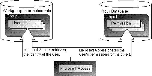 When a user opens a secured database, Access determines the user's level of access to an object (including the database itself) by checking the set of permissions assigned to that user for that object. Different users and groups can have different permissions for the same objects. Every time the user tries to perform an action on an object, such as opening a form, running a query, or modifying the data in a table, Access checks to see whether the user, or any of the groups to which the user belongs, has the necessary permissions to carry out the operation. If so, the action is performed. If not, Access informs the user that he or she does not have permissions to perform the requested action, and the operation fails.
