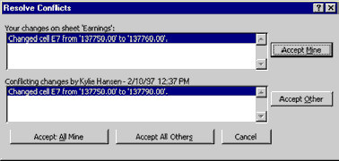 When two or more users of a shared workbook make conflicting changes (for example, entering different values in the same cell), users can either review the conflicts or automatically save their own changes when they save the workbook. Users set this option for themselves in the Conflicting changes between users group on the Advanced tab in the Share Workbook dialog box (Tools menu). If users choose to review changes, they see a dialog box similar to the following when they either save a workbook to which another user has made conflicting changes, or when the Update changes time value is met.