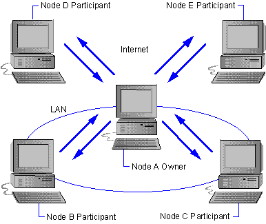 A presentation conference consists of the presenter (or conference owner) and the audience (or conference participants). The following diagram illustrates a presentation conference. Computer A, located in Oregon, is the conference owner and controls the presentation. Computer B in California and Computer C in Ireland are conference participants, or nodes, linked to the conference owner.
