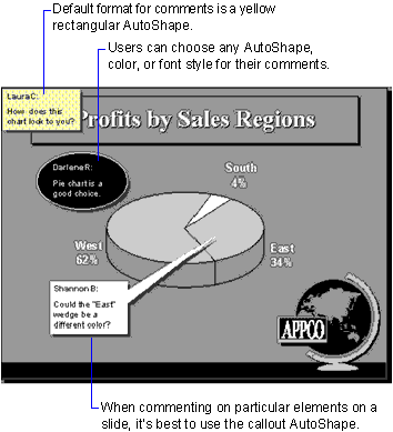 Comments are text objects with unique formatting. You can change the default formatting of the object using the Comment command (Format menu), and you can change the shape of the object by using commands on the Change AutoShape submenu (Draw menu). Each user in the workgroup can use a different shape or format to differentiate comments, as shown in the following illustration.