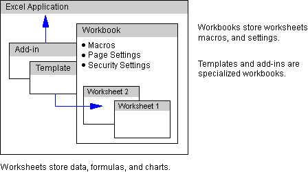 You can save a workbook as a template. A template provides a pattern for creating new workbooks. You can also save workbooks as addins, which programmatically add custom features to Excel. The following illustration shows how Excel components fit together to create a workbook.