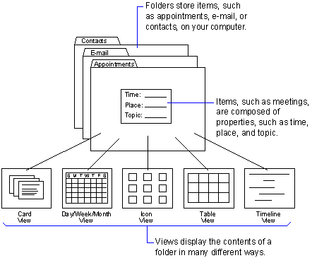Outlook stores items in folders, with each folder containing items of a particular type. These item types include Outlookspecific items, such as Journal items, as well as files stored on your computer or on the network.