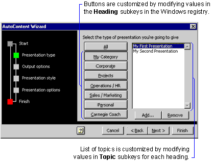 Tip If users have already installed PowerPoint, you can customize the AutoContent Wizard interface by distributing a REG file. For more information about creating and distributing REG files, see "Add-ins" earlier in this chapter.