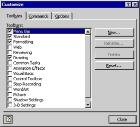 The following illustration shows the Toolbars tab in the Customize dialog box displayed by PowerPoint.