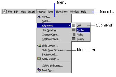 A menu is a list of menu items that appears (drops down) when you click a menu name on the menu bar.