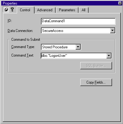 Then I inserted a design-time Data Command control. Figure 13 shows the Data Command Control dialog. First, select the data connection that you will use. This data connection must point to your database that contains the user name and group tables. Next, select Stored Procedure from the Command Type list. Now you can select the LogonUser stored procedure you created earlier from the Command Text list.