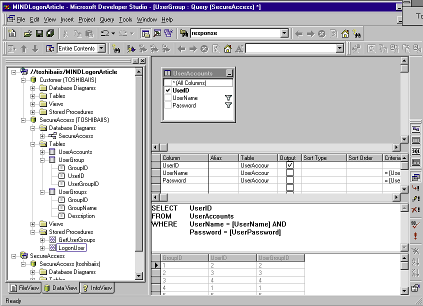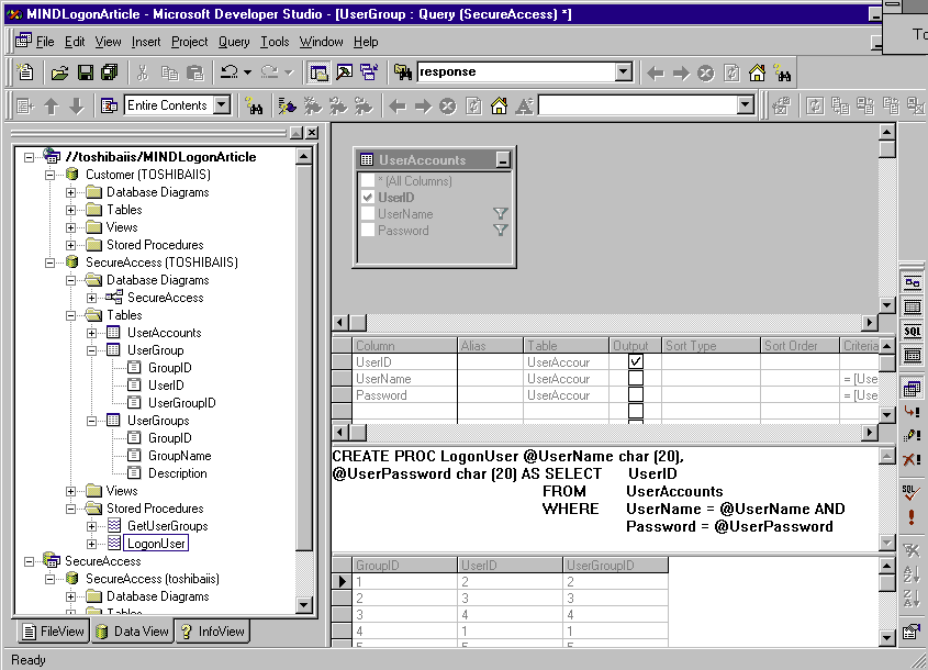 Next I created two stored procedures. Logonuser checks the username and password fields and returns a UserID if the lookup is successful. GetUserGroups returns all the groups for a specific UserID. These two stored procedures retrieve all of the user information when a user logs in.