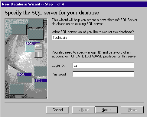 I used the New Database Wizard to create the SQL Server database. The database creation steps in this section will only work on SQL Server 6.5 with Service Pack 1 or higher. If you’re using Microsoft Access, Oracle, or another database, you must use the techniques required by your database to create the database structure.