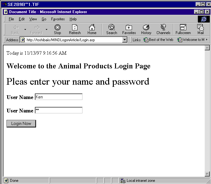 Now I can create the login code and begin to build the application. First, I have to build the user interface. I used the FrontPage® 97 Editor to create this page. The page is shown in Figure 8, while the code is shown in Figure 9. The login page is displayed automatically by the code in Global.asa (see Figure 9).