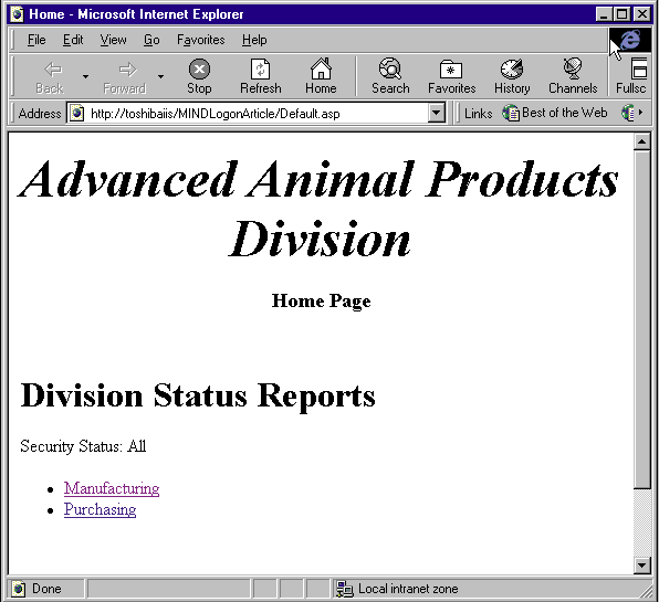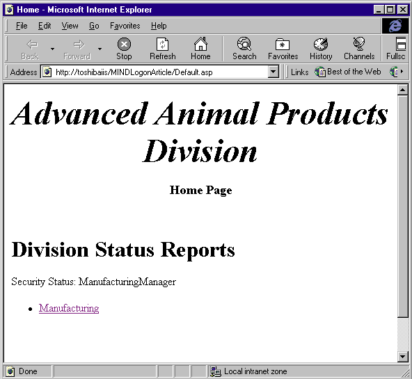 Figure 2 shows the same home page as displayed for a user from the ManufacturingManager group. Notice the link to the Manufacturing data. Also notice that the Purchasing link shown in Figure 1 is missing. These are the only two links on the page, but I could easily add many more based on the group definitions of the users.