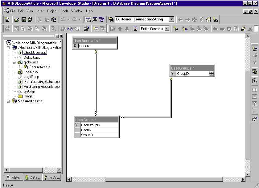 The first thing I created was the database, which is easy if you understand the user requirements. This database must hold the user name, password, group names, and a link between group names and user names. Figure 3 shows the structure of the database as displayed in the Database Diagram window in Visual InterDev™.