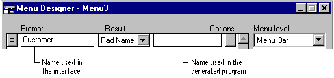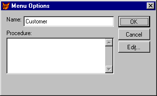 For example, insert a Customer menu before the Help menu by choosing the mover button associated with the Help menu, choosing the Insert button, and then typing Customer in the Prompt column. The result looks like this: