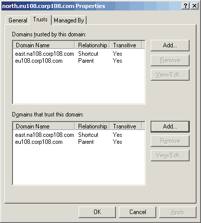Win2K contains five basic types of trust relationships, as Table 1 outlines. You can view trust relationships through each domain objects' properties, as Screen 3 shows, or you can use the trustdom.exe command prompt utility. You can also use these tools to explicitly create trusts. End users who are working from Kerberos-compliant workstations can see the effect of transitive trusts when they log on. They can choose every domain with which their domain has a direct trust or an indirect trust. An NT 4.0 end user sees only the direct trusts of his or her domain.